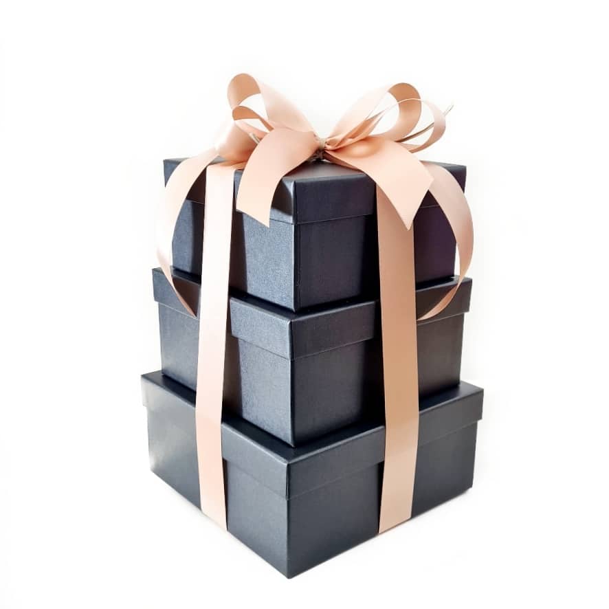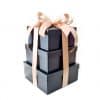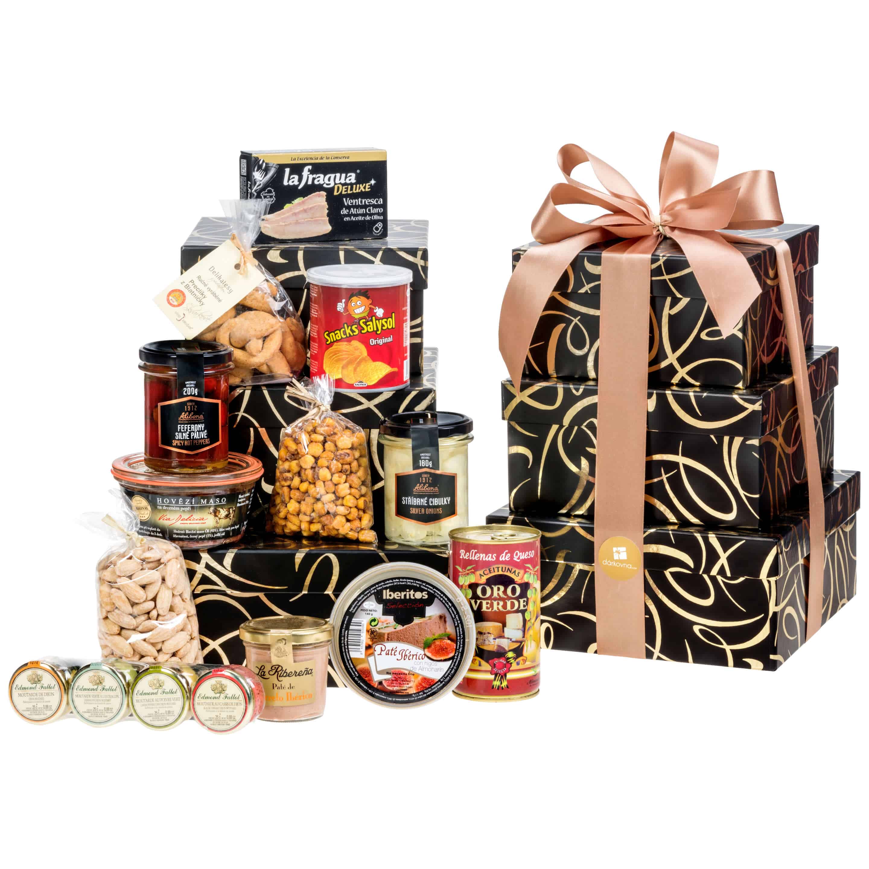 Luxusní kaskáda sladěná do černo-zlaté barvy. Každá z dárkových krabiček v sobě ukrývá lahodné delikatesy, masové speciality, nakládanou zeleninu, španělské olivy, francouzské hořčice nebo také výtečné domácí škvarkové preclíčky.