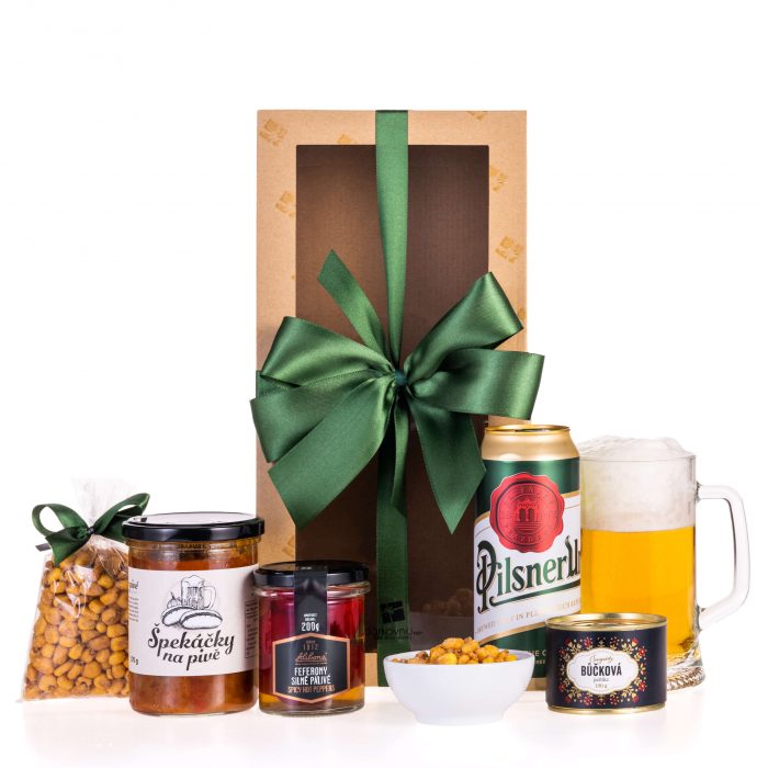 Zlatý mok v podobě plzeňské klasiky je české pivo, které milují jak muži, tak ženy. Dárkový box doplňují také špekáčky na pivě, výtečná paštika z bůčku nebo jemně pikantní kukuřice v barbecue těstíčku. Působivý dárek, který nadchne každého pivomilce .