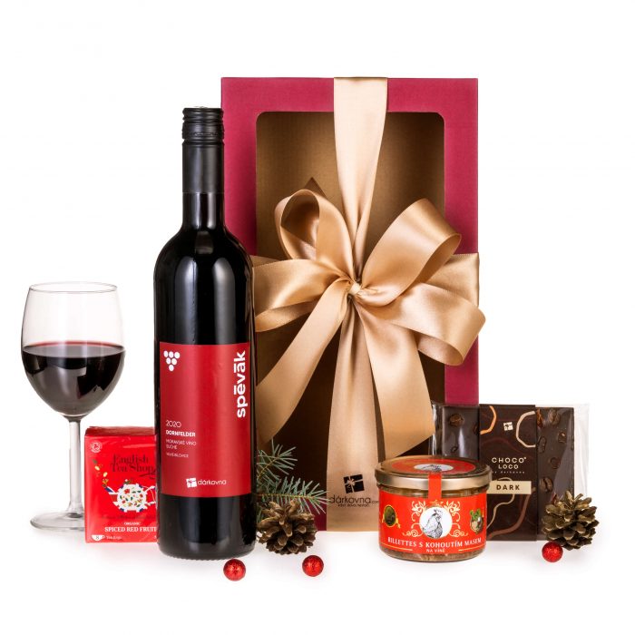 - Červené víno Dornfelder, suché víno z Moravy tmavě červené barvy s výrazným ovocitým buketem, velmi extraktivní až tělnaté chuti. Vinařství Spěvák, 0,75 l