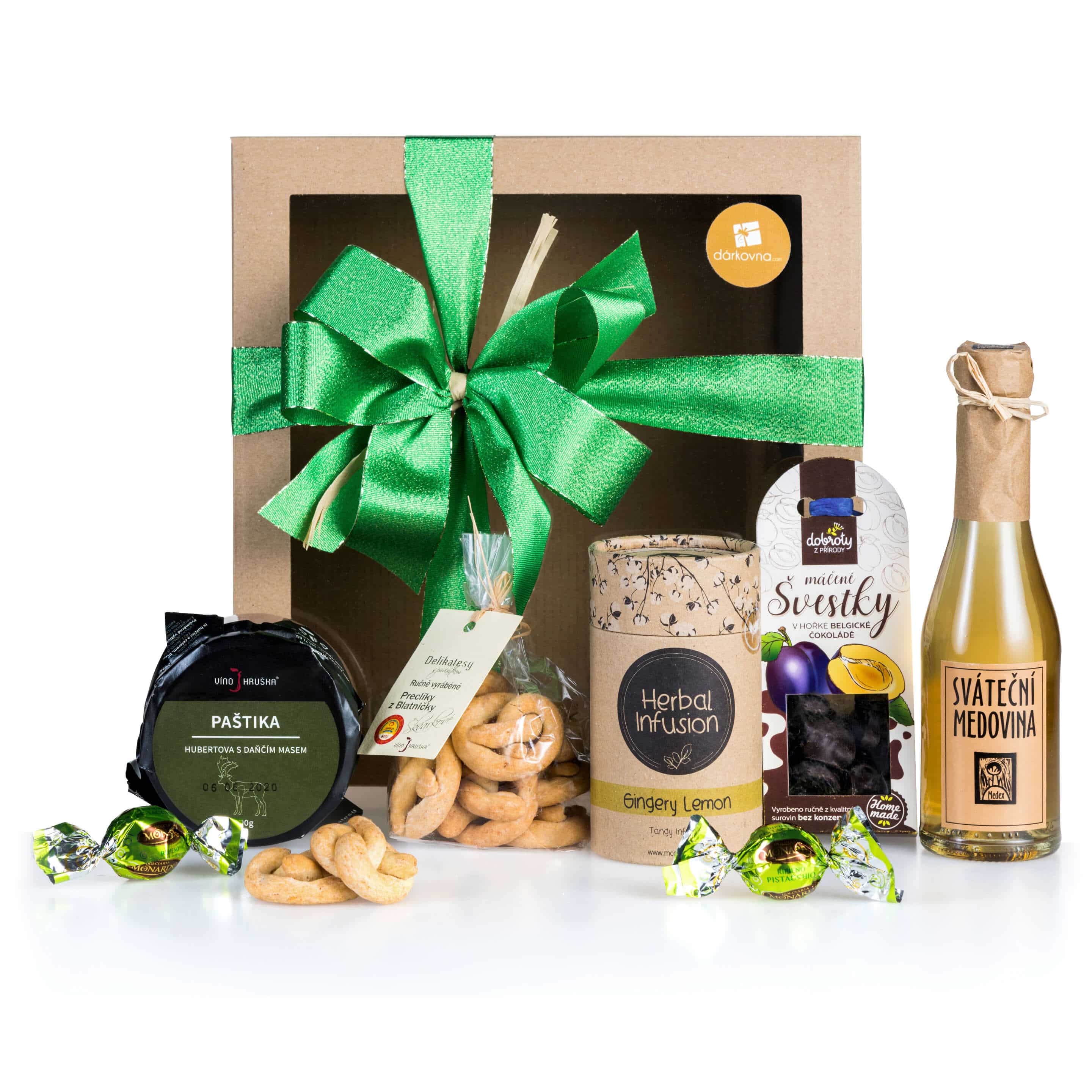 Obdarujte milovaného muže krásným dárkem, který potěší a báječně chutná! Dárkový box v sobě ukrývá pálenku y medovinu, která zahřeje za každého počasí, úžasné švestičky máčené v pravé belgické čokoládě, jemnou gurmánskou paštiku a další pochoutky.