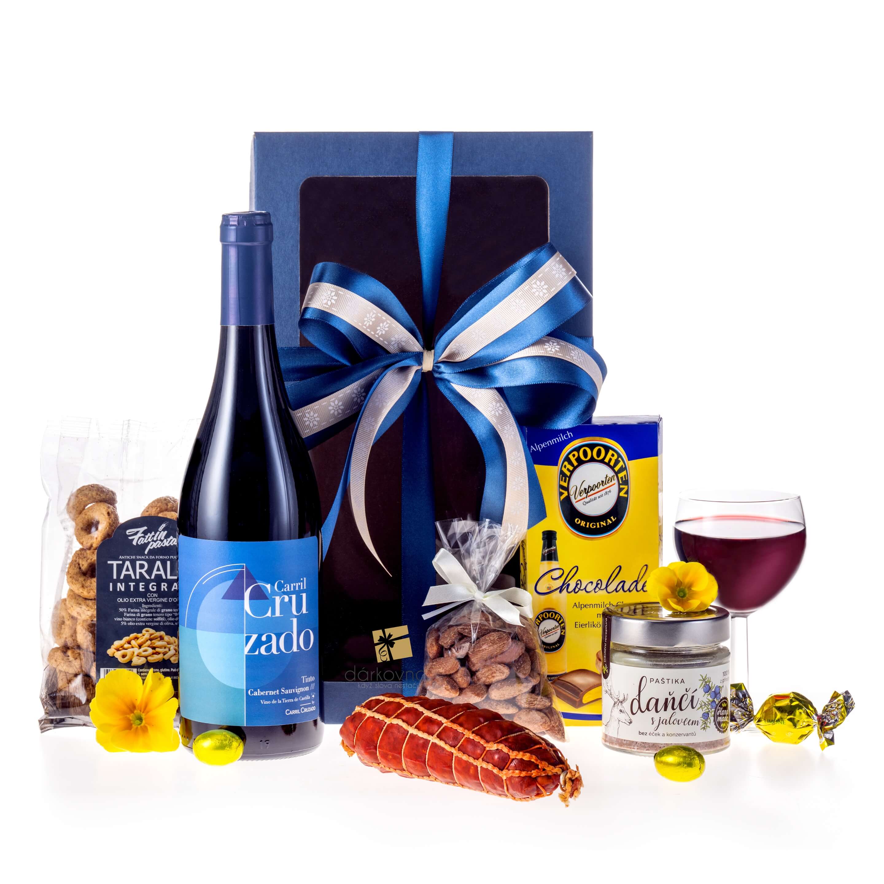 Náš nový dárkový box s červeným vínem a sladkými i slanými delikatesami je veselý a hravý. Muže potěší nejen gurmánské lahůdky, ale i sklenka výtečného vína.