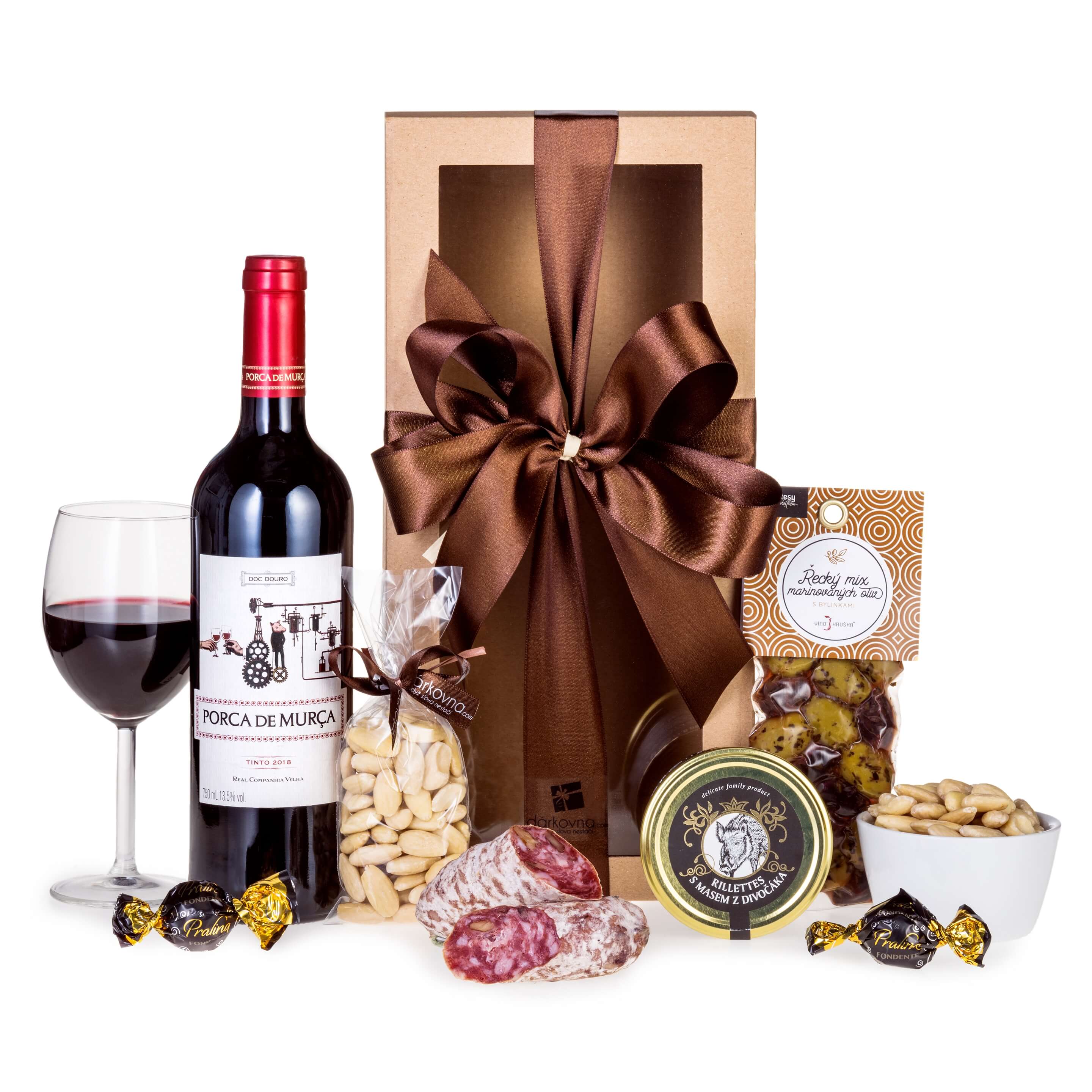 Krásný, promyšlený box, kterým uděláte radost téměř každému. Vynikající medailemi ověnčené červené víno, k tomu na farmářských trzích vyhlášená klobáska s vlašskými ořechy, maso z divočáka od českého malovýrobce, v bylinkách marinované olivy, solené mandličky i něco sladkého na závěr. Gurmánské hody mohou začít!