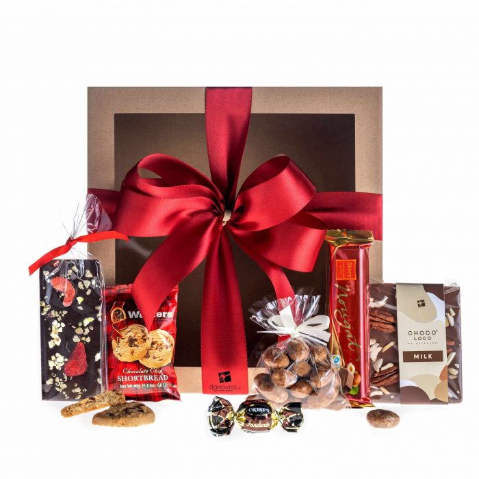 Výběr čokoládových lahůdek v dárkovém boxu, které zaručeně okouzlí a chuťově uspokojí každého milovníka sladkostí. Tento dárkový koš je oblíbeným firemním dárkem!