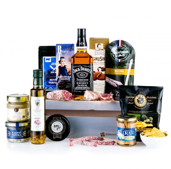 Nadupaný dárkový koš pro opravdové chlapy – gentlemany, kteří ocení kvalitu dobré whisky a rádi si pochutnají také na netradičních delikatesách. Výjimečný dárek pro výjimečné muže!