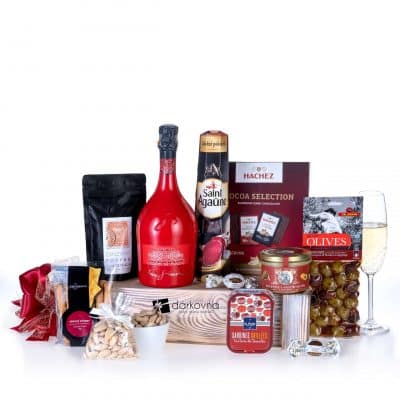 Tento dárkový koš obsahuje čerstvé potraviny (klobásky, sýry atd.). V letních měsících nahrazujeme za produkty trvanlivé.