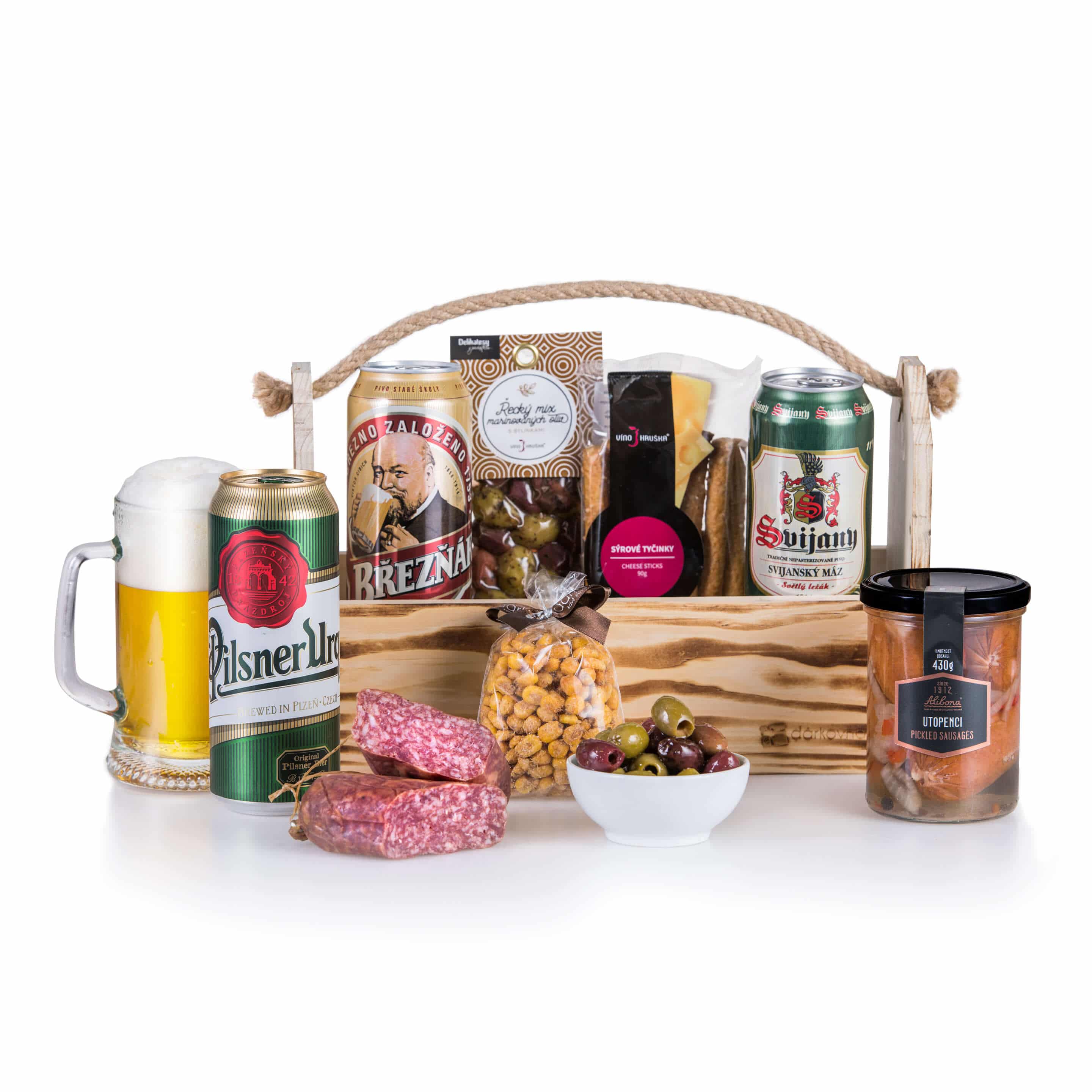Praktický „nosič“ piva nebo také stojan na omáčky. Tento krásný dárek pro muže i pro ženy potěší od A do Z! Obsahuje oblíbená česká piva a osvědčené české masové delikatesy jako jsou UTOPENCI a „LOVEČÁK „.