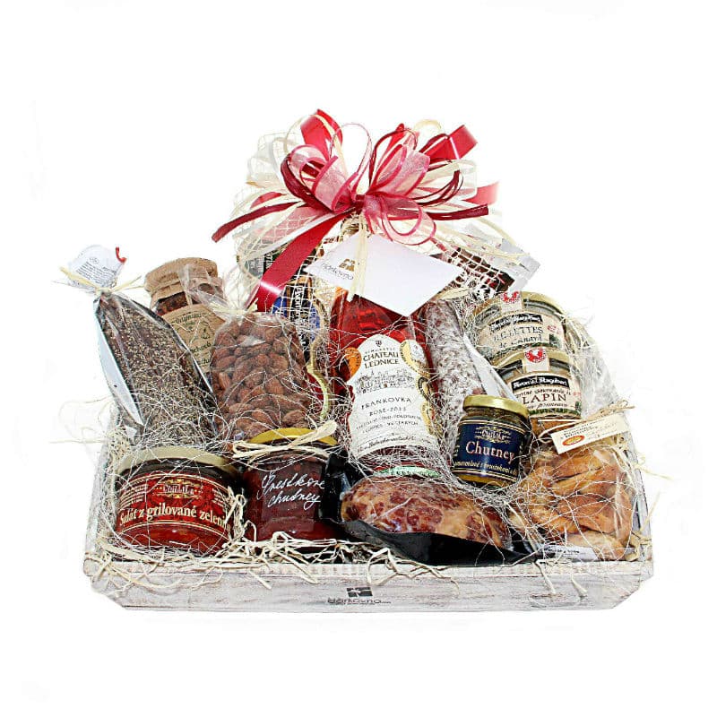 Tento dárkový koš obsahuje kvalitní čerstvé potraviny (klobásky, sýry atd.). V letních měsících nahrazujeme za produkty trvanlivé.