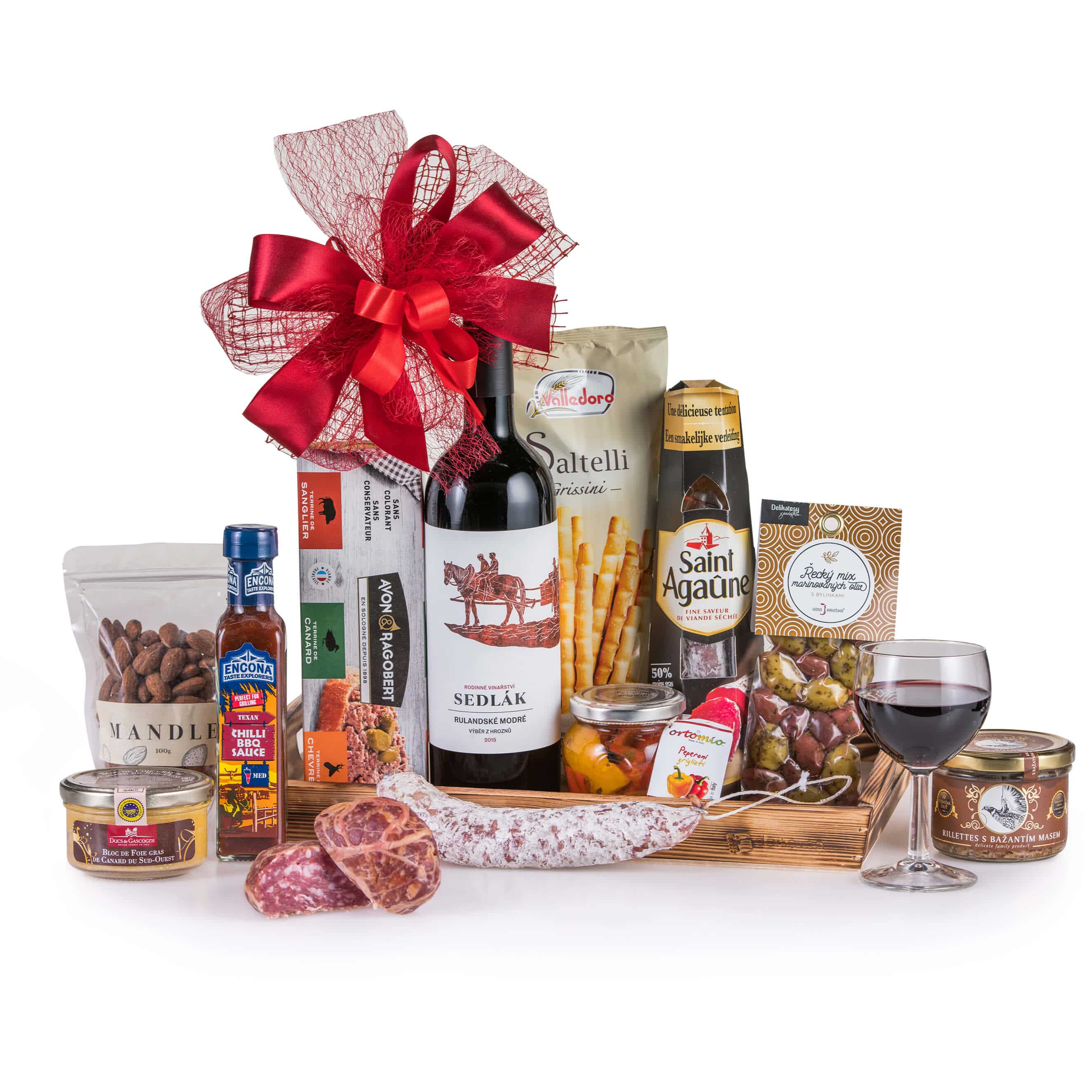 Moderní, originální a praktický dárek pro milovníky masa a masových delikates. Na ručně vyráběném dřevěném podnosu Vám naservírujeme luxusní francouzskou klobásku, nedostižné riletty, mortadelu (vítězku italského klání řezníků) a další šťavnaté masové lahůdky. Masové hody doprovodí vyuzené mandle, domácí sýrové špalíčky, omáčka s jalapeňo. Nechybí ani lahev nádherného vína, v tomto případě RULANDSKÉ MODRÉ, které masu dělá tu nejlepší společnost.