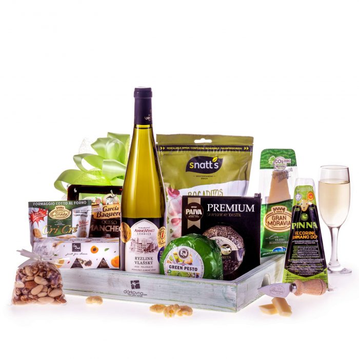 Luxusní, originální a praktický dárkový koš pro milovníky sýrů a dobrého vína! Vybrali jsme pro Vás mix vyhlášených sýrů z celé Evropy, doplnili je výběrovými oříšky a luxusními omáčkami, a vše naaranžovali na ručně vyráběný servírovací podnos. Samozřejmě nechybí ani láhev nádherného bílého vína, ověnčeného hned několika medailemi a něco na zakousnutí.