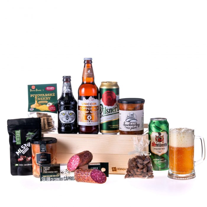 Luxusní dárkový koš plný piv a nejlepších lahůdek k pivu, které můžete hned ochutnat. Ohromte milovníka piv nejen zlatým mokem, ale také netradičními masovými delikatesami!