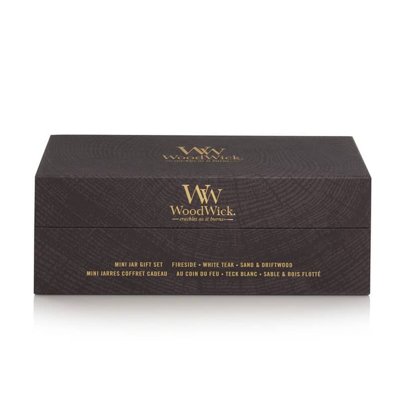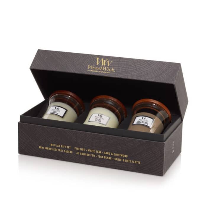 WoodWick – Elegantně zabalená pánská dárková sada s dřevitými vůněmi obsahuje malé svíčky Fireside, White Teak a Sand & Driftwood. Fireside přináší charakteristickou vůni polínek v hořícím krbu, White Teak je svěží kompozice dřevin, mechu a moře a Sand & Driftwood okouzlí vaše smysly vůní citrusů, ozónu, cedru a cypřiše. Každá svíčka zajistí až 30 hodin vůně, doprovázené jemným praskáním ikonického dřevěného knotu.