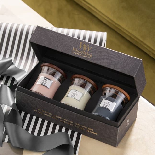 Dámská dárková sada se svíčkami WoodWick s květinovými vůněmi.