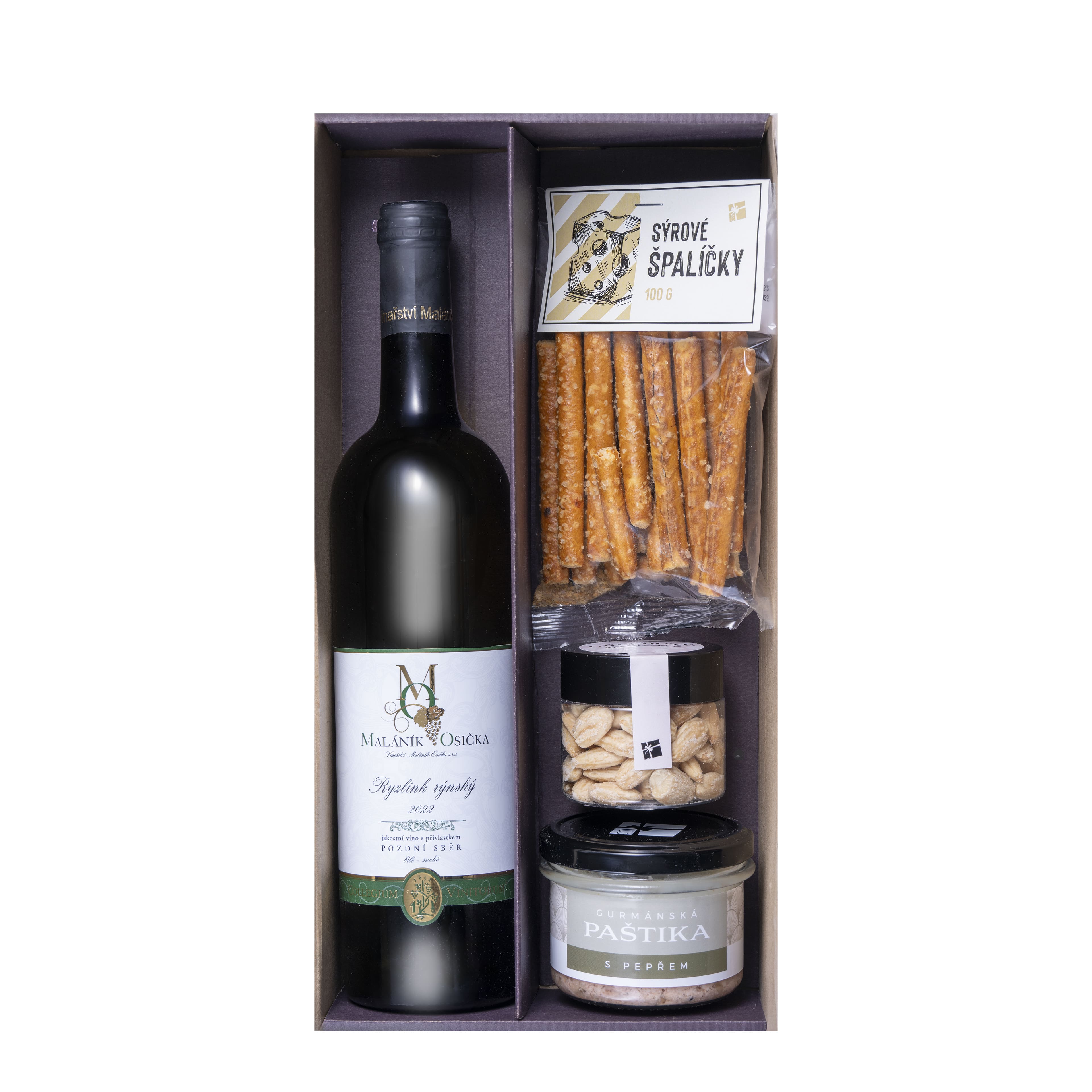 Dárkový box pro milovníky bílého kvalitního vína a delikates. Vhodné jako poděkování i jako firemní dárek.