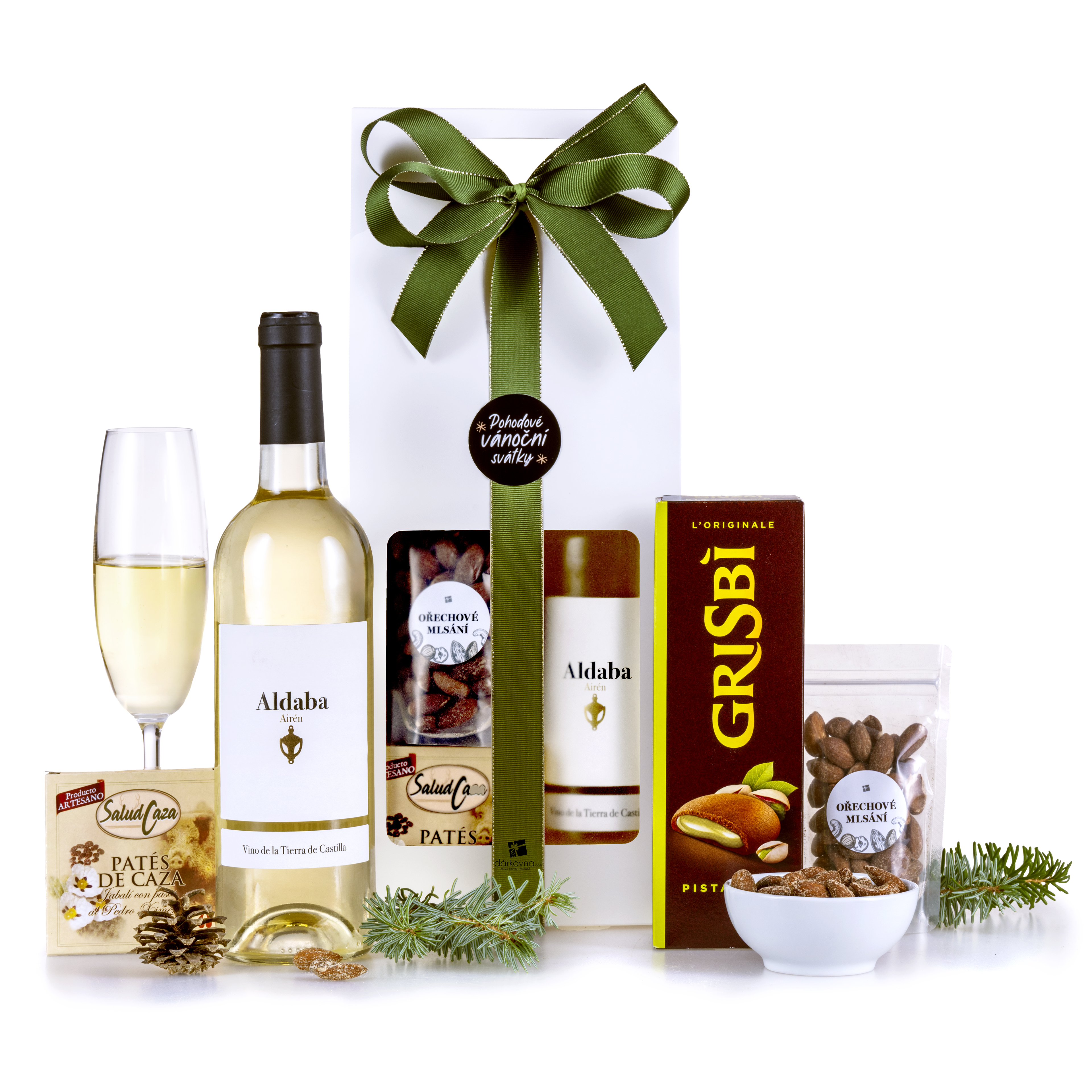 Vánoční dárkový koš v novém odnosném balení. Novinka letošních Vánoc. Svěží bílé víno doplněné o hříšnou kombinaci slaných a sladkých delikates. Dárek, který bude pro obdarovaného vyváženou kombinací dobrot a skvělým dárkem.