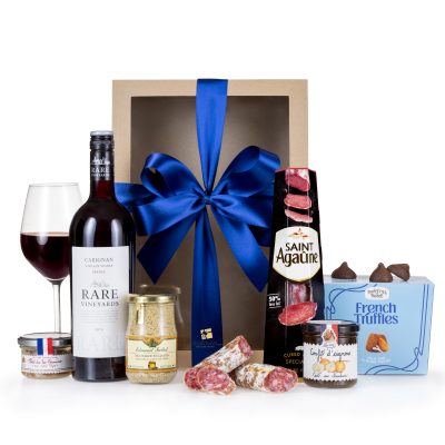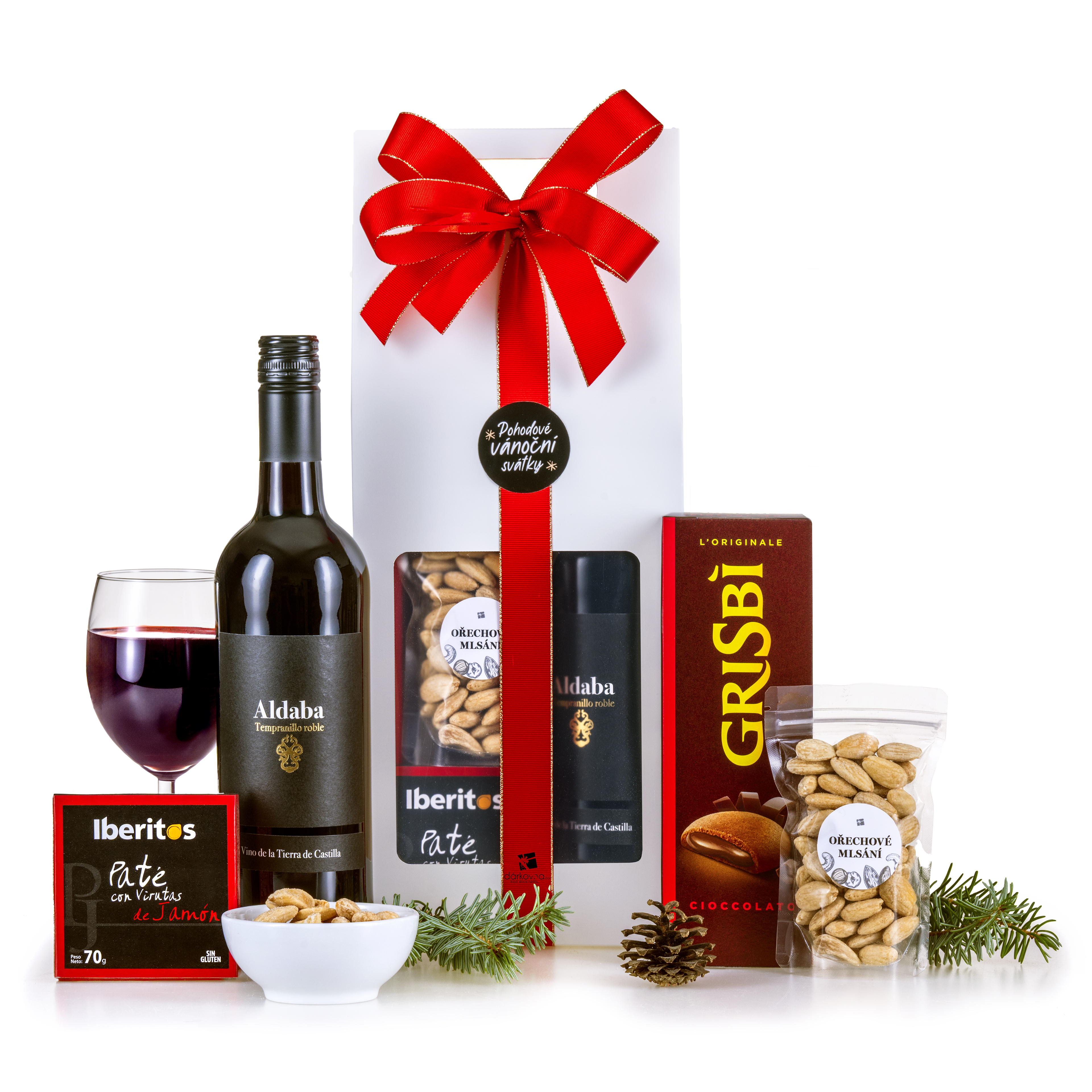 Vánoční dárkový koš v novém odnosném balení. Novinka letošních Vánoc. Suché červené víno doplněné o hříšnou kombinaci slaných a sladkých delikates. Dárek, který bude pro obdarovaného vyváženou kombinací dobrot a skvělým dárkem.