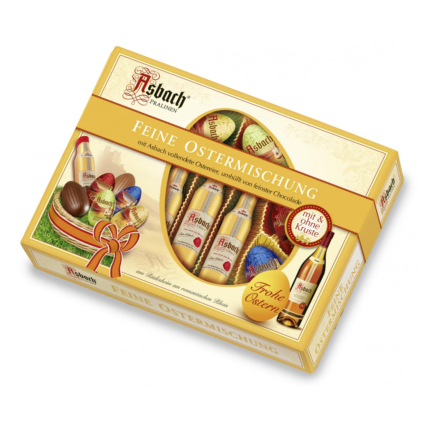Velikonoční vajíčka a lahvičky v mléčné a hořké čokoládě plněné jakostním brandy ASBACH. 150g