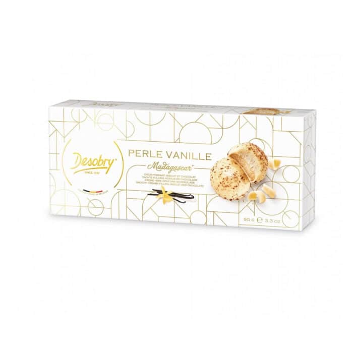 Desobry – sušenky s bílou čokoládou a vanilkovou náplní. Perle vanille je umělecké dílo, které uspokojí potřeby milovníků bílé čokolády! Tato 9 gramová sušenka je vyrobena z madagaskarského bourbon vanilkového čokoládového krému na křupavé sušence. Celek je potažen bílou čokoládou a posypán kakaovým práškem. 95g