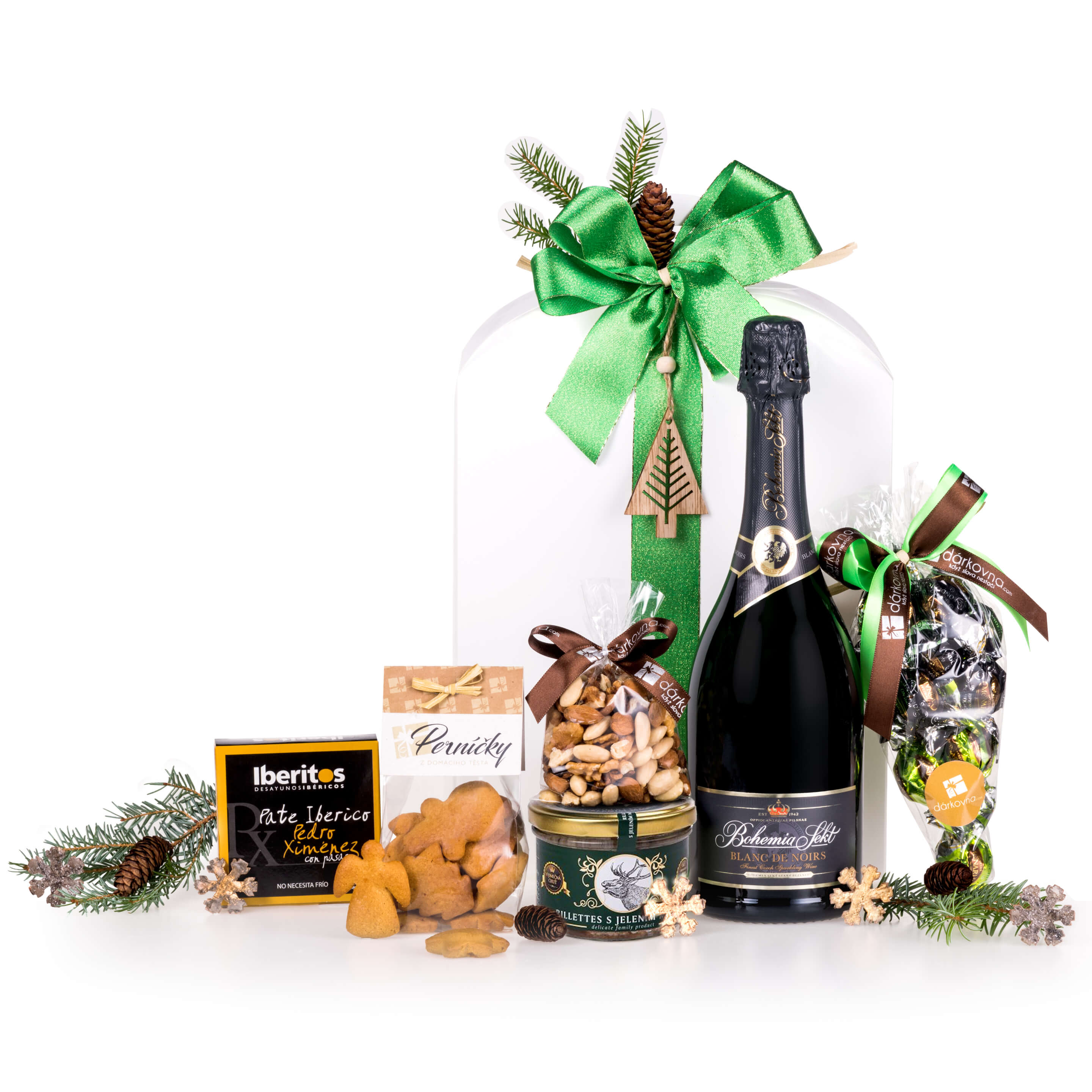 Vánočně laděný box bude pro vaše blízké příjemným vánočním dárkem! Ani svým obsahem nezklame a při rozbalení tohoto dárku potěší srdce milovníků masových specialit, sladkých a slaných pochutin a tradičního šumivého vína.