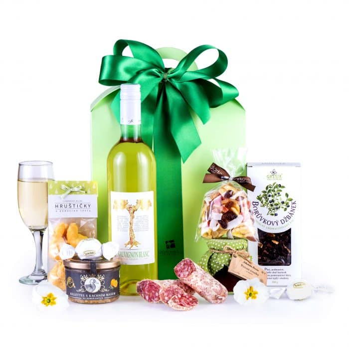 Dárkový box laděný do svěží světle zelené barvy, plný pochoutek s dotekem ovoce. Potěší každého gurmána, který má rád netradiční spojení chutí a zároveň si rád pochutná na sklence lahodného bílého vína.